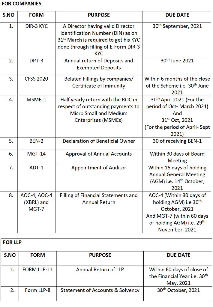 Compliance Calendar for Companies and LLP under Companies Act, 2013 for F.Y. 2021-2022